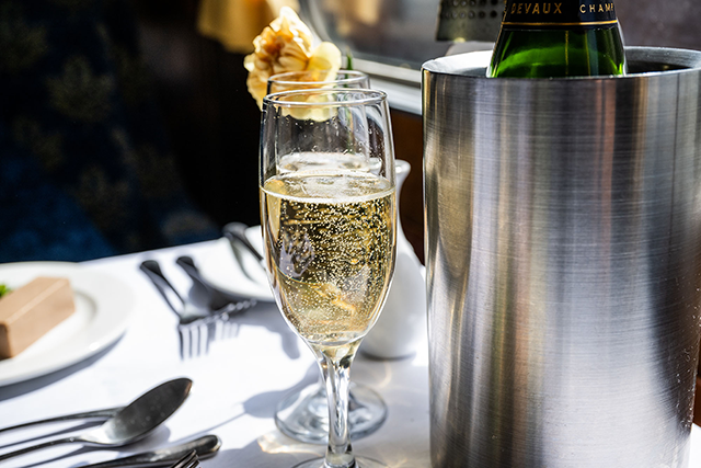- Glass of Three Choirs sparkling wine on arrival