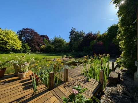 Garden created over 30 years on a blank canvas apart from a few spectacular mature trees. These are a Cedar of Lebanon, 3 copper beeches and Wellingtonia. As our knowledge and understanding of the site and the soil has developed, the 1½ acres has matured into a wonderful backdrop of colour and texture from new trees, shrubs and perennials with sculpture highlights. It sets off a restored Georgian/Tudor house (not open). We have been influenced by the gardening skills of our parents, by our travels and by our desire to plant for scent and to attract wildlife. A trip to Japan led to the creation of a large pond in front of the house. Once we had a London allotment; now we have a walled vegetable and flower garden which helps feed us and provide flowers for cutting. In June, we have roses, clematis and lavender to give colour and attract bees. We are almost totally organic with plenty of wildlife in every part of the garden.